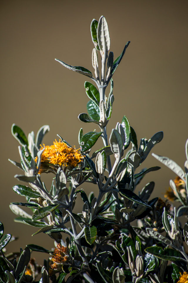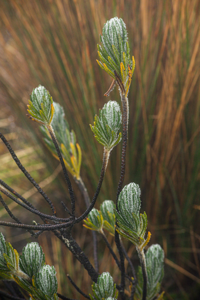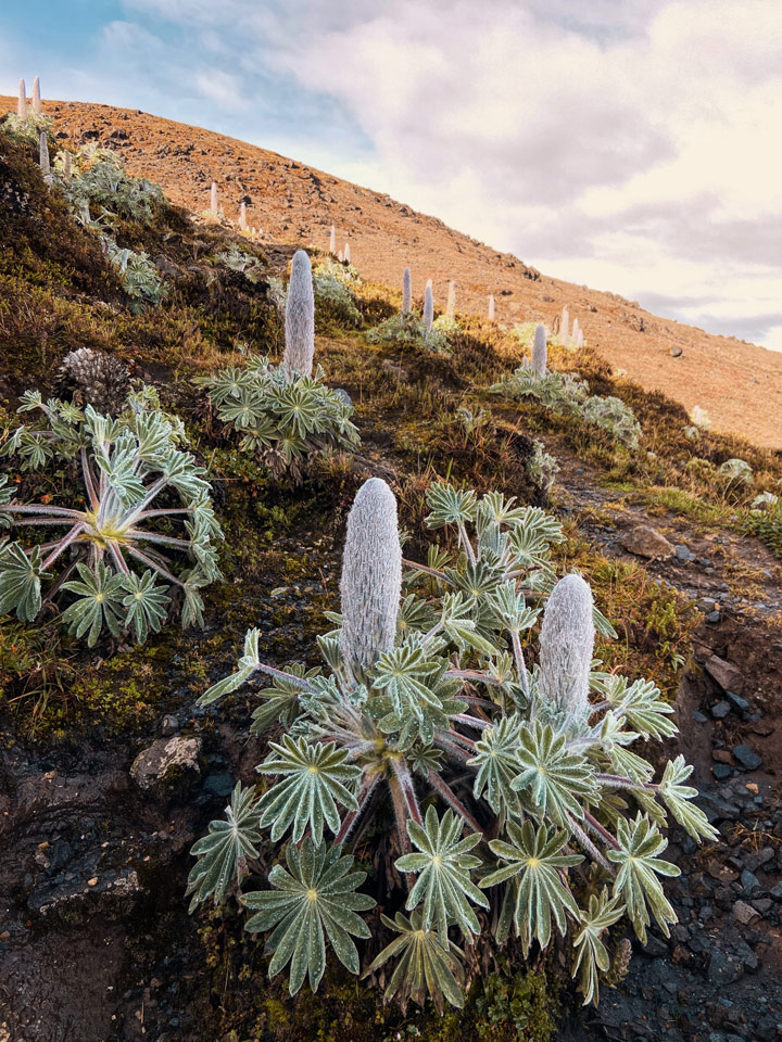 Hojas pubescentes de frailejones (Espeletia sp.) y Velón de páramo. (Lupinus alopecuroides) Foto: Alejandro Calderón