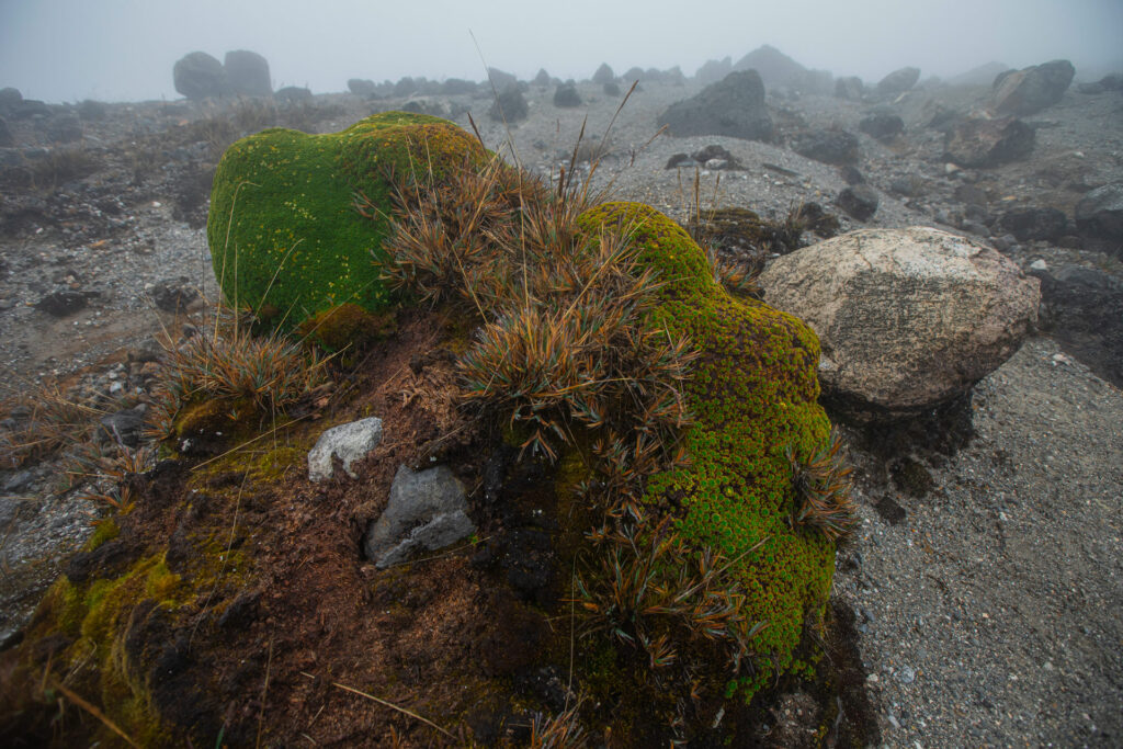 En el páramo existen plantas que crecen en forma de cojín o tapete, se ramifican densa y radialmente formando un colchón capaz de almacenar una gran cantidad de agua y nutrientes. Estas plantas protegen sus partes internas creando una barrera con materia orgánica y hojas muertas, aislándolas del frío extremo, el viento y la depredación.